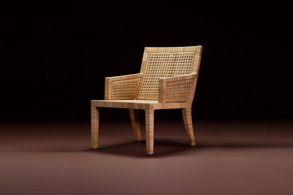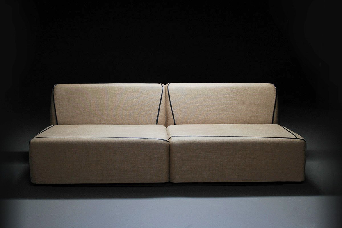 Structure en tissu ou cuir tendu. Coutures décalées bordées d’un galon de cuir marron.