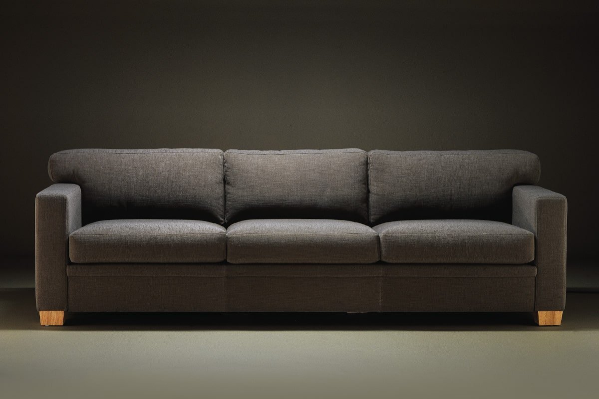 Structure et coussins recouverts de tissu ou de cuir. Assise en Bultex, dossier en demi-duvet. Sabots en chêne vernis.