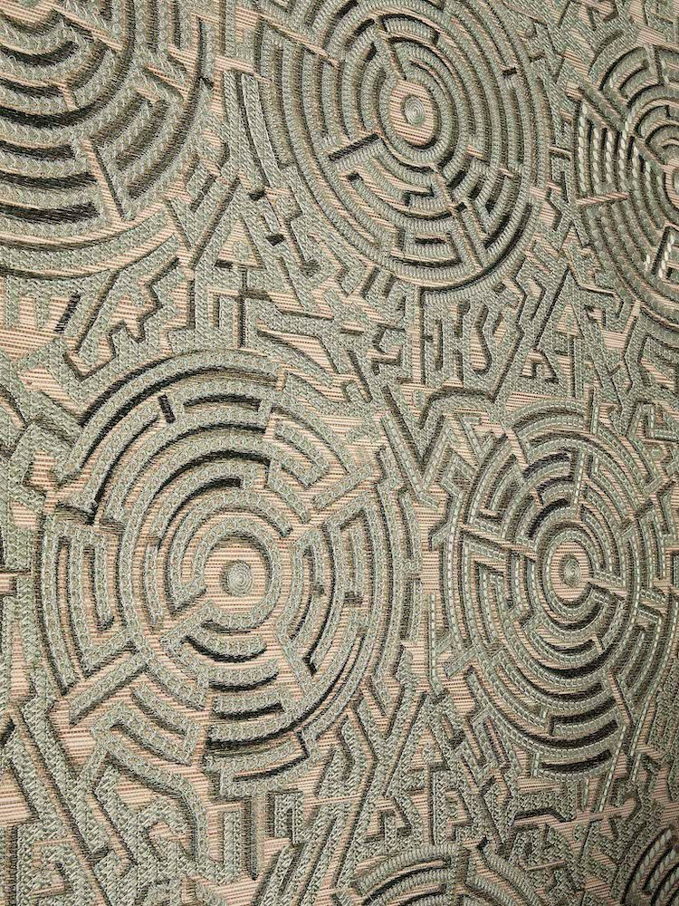 Vues du ciel, ces haies s’imbriquent à la manière de labyrinthes tels des symboles de patience et de réflexion sur soi. Hommage aux constructions paysagistes, ce dessin combine des références aux jardins du XVIIIe siècle pensés par Lancelot Brown ainsi qu’aux ouvres illusionnistes d’Escher. Brodés sur paille en petite largeur et contrecollés sur un support papier, les motifs jouent avec la lumière par des effets de points différents créant un effet de volume.