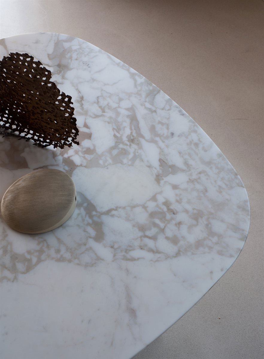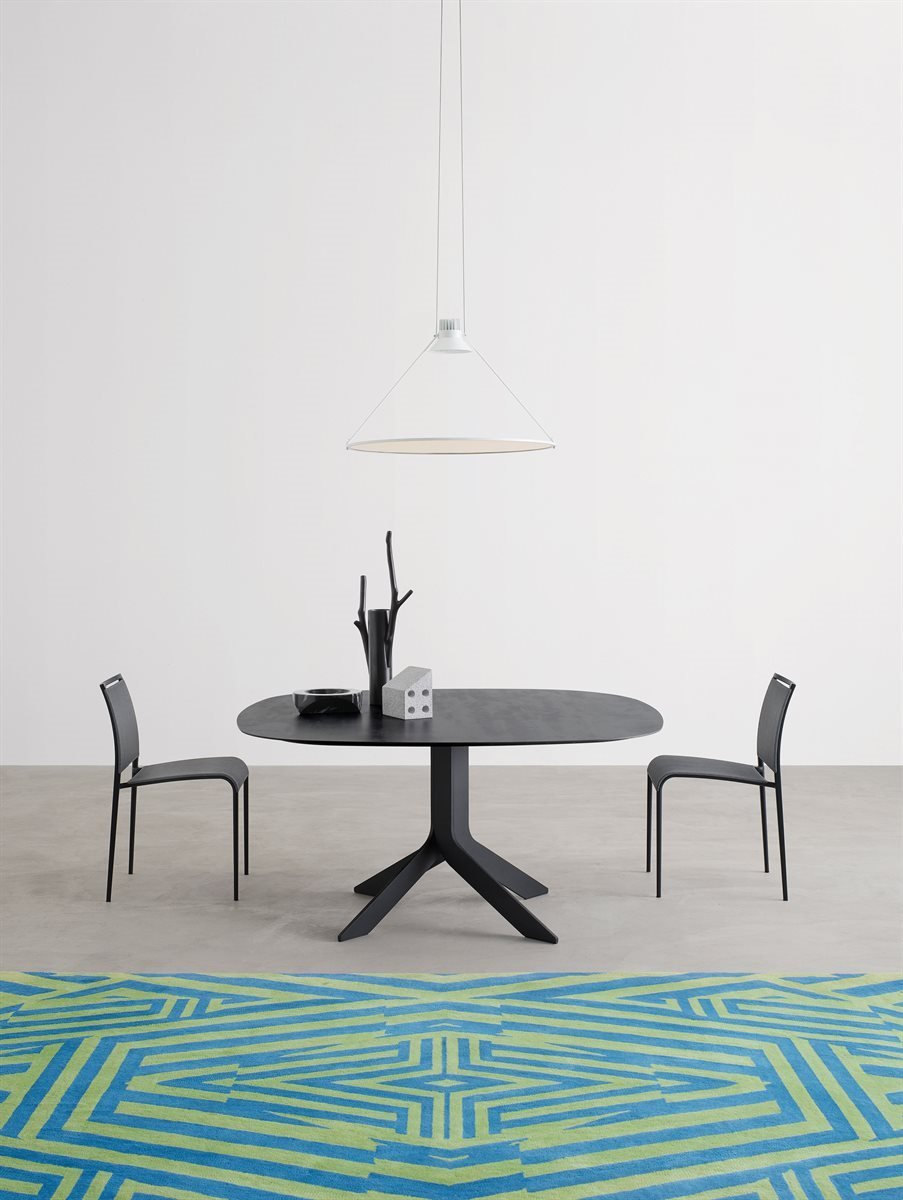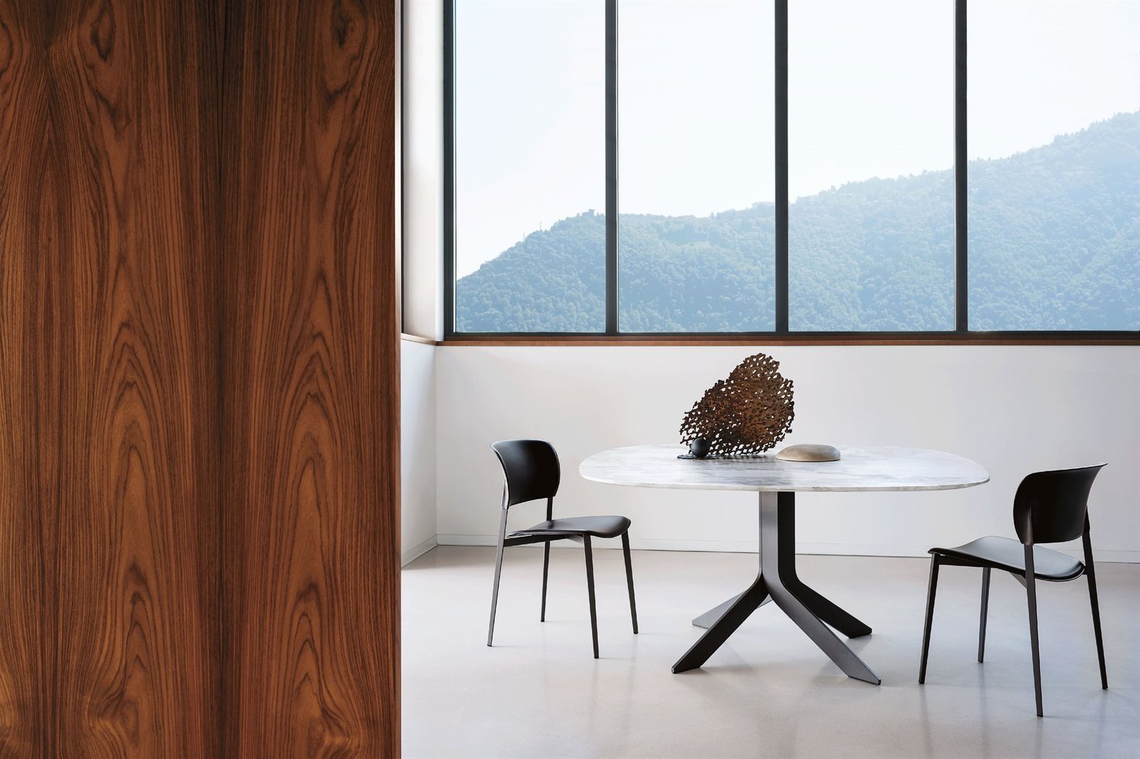 La table Iblea combine un design dynamique avec une élégance technologique. La perfection circulaire de son plateau se marie harmonieusement avec la stabilité géométrique de sa base.