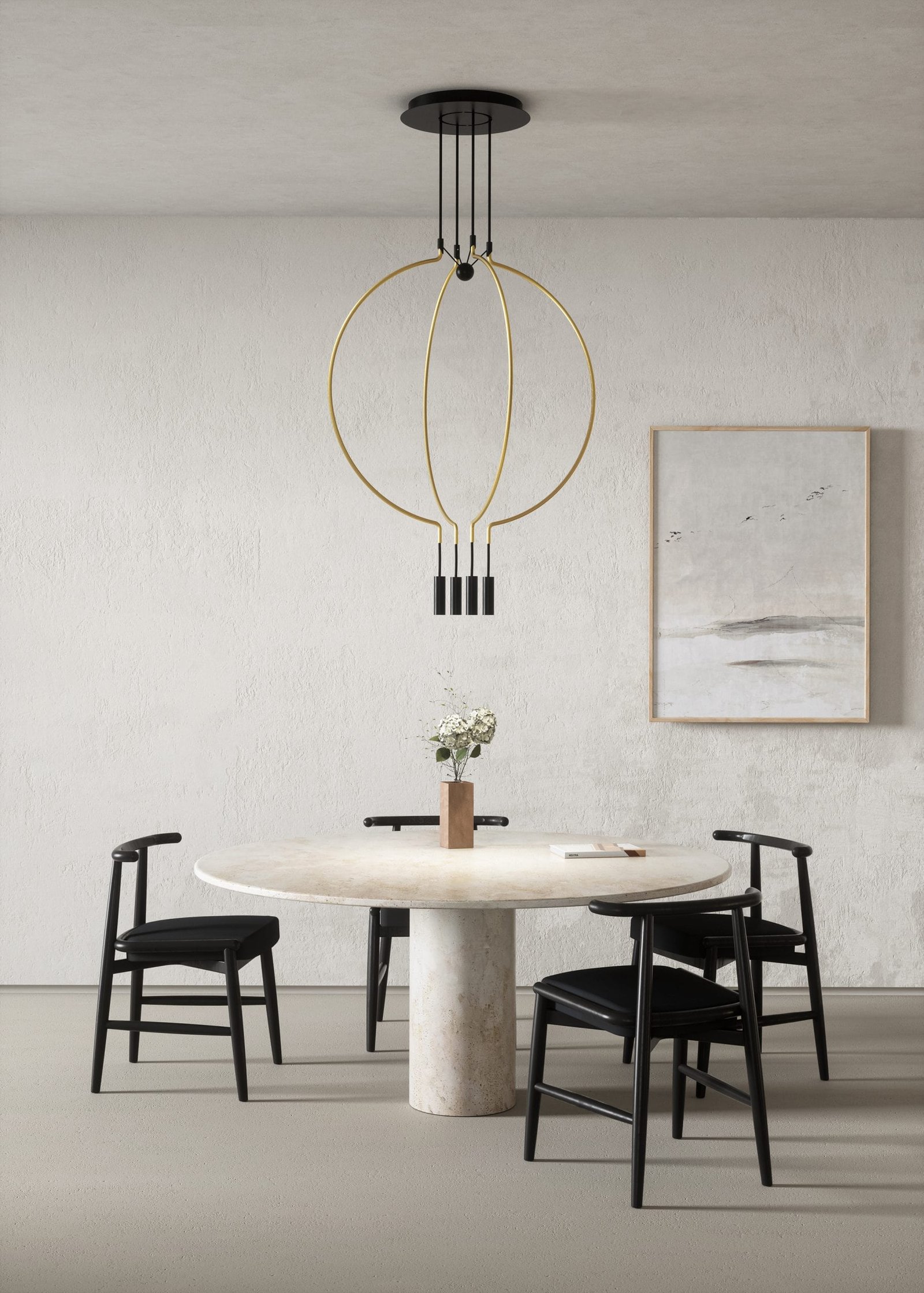 Légèreté et élégance modulaires. Liaison raconte l’équilibre parfait de trois archétypes géométriques : la sphère, le cercle et le cylindre composent un système qui comprend le pendentif unique ainsi que les multiples compositions.