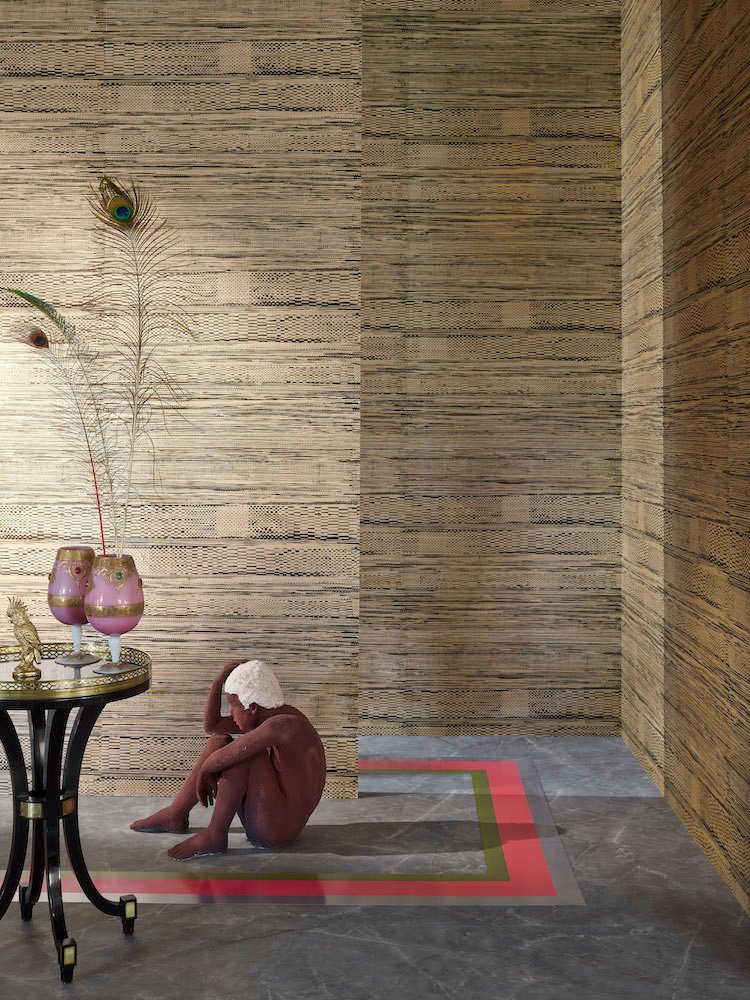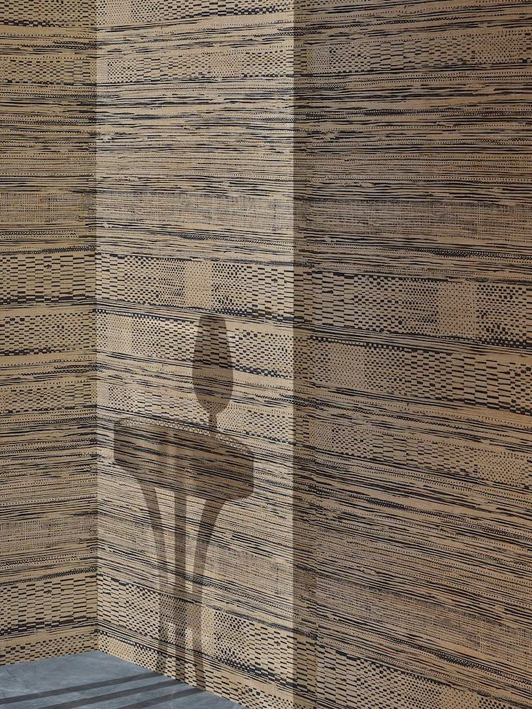 Entre motif et texture, ce dessin évoque les tissages des paniers en lin ou papyrus égyptiens. Impression sur fond artisanal en raphia métallisé contrecollé sur intissé.