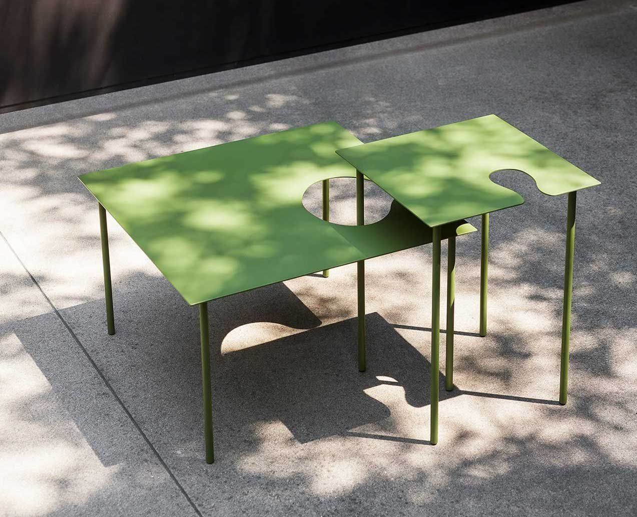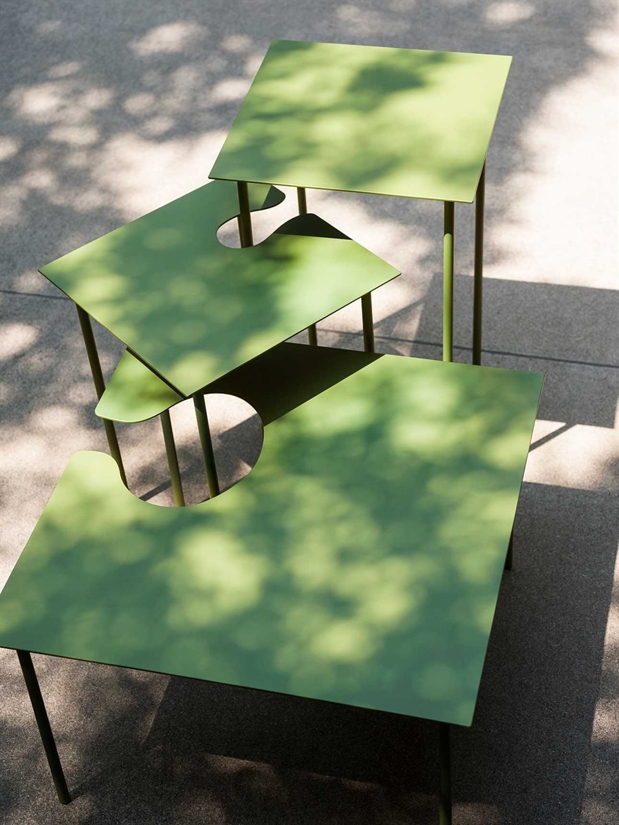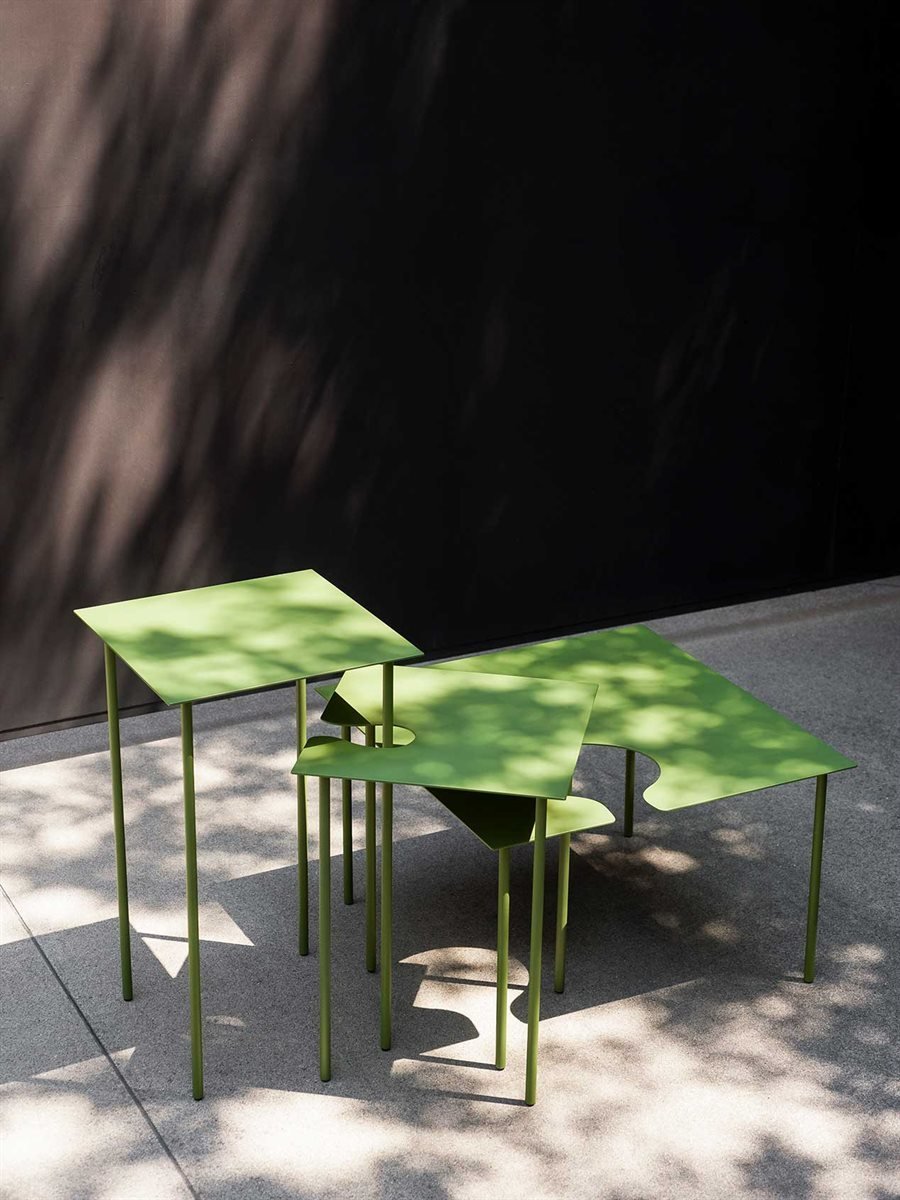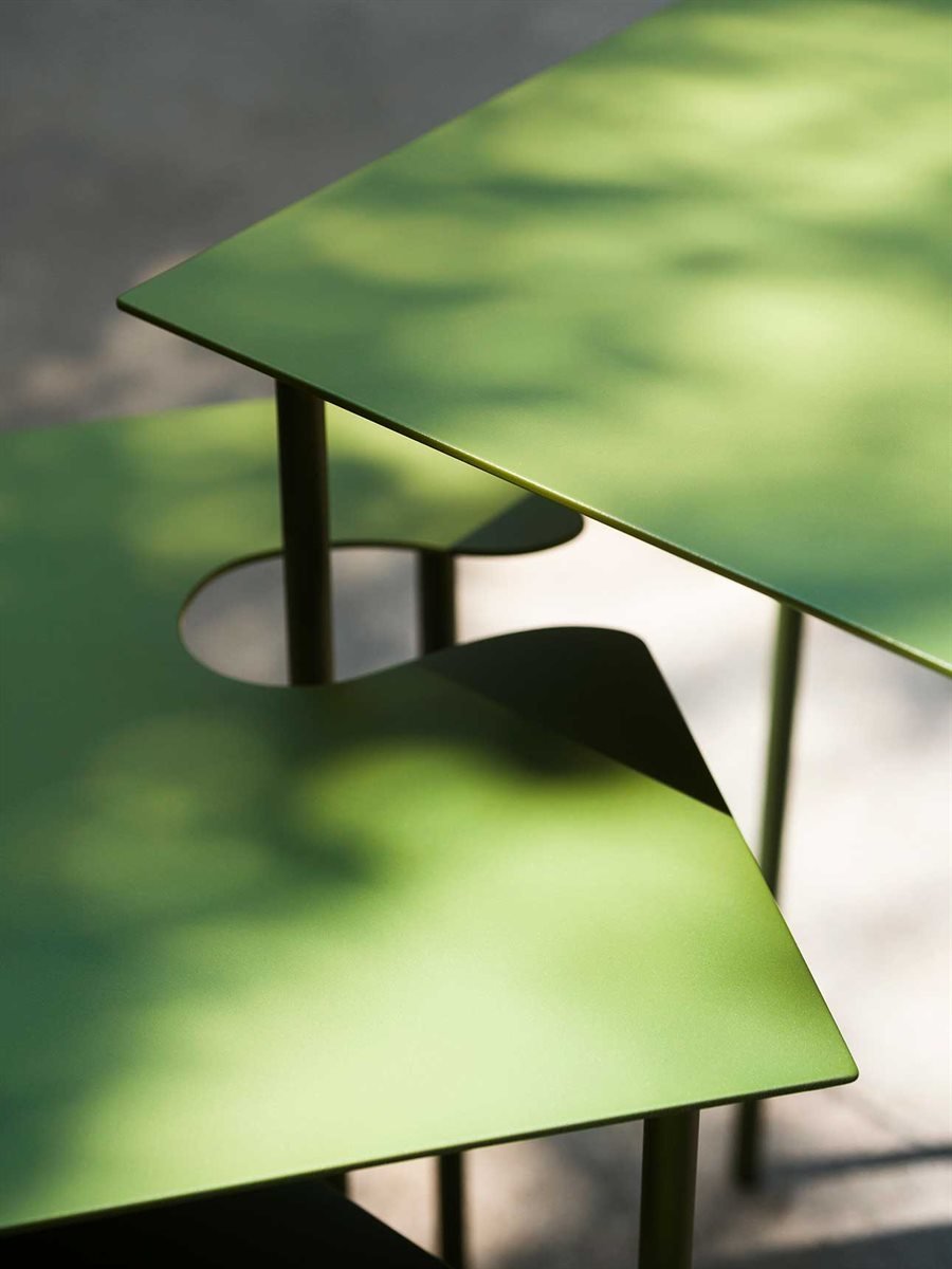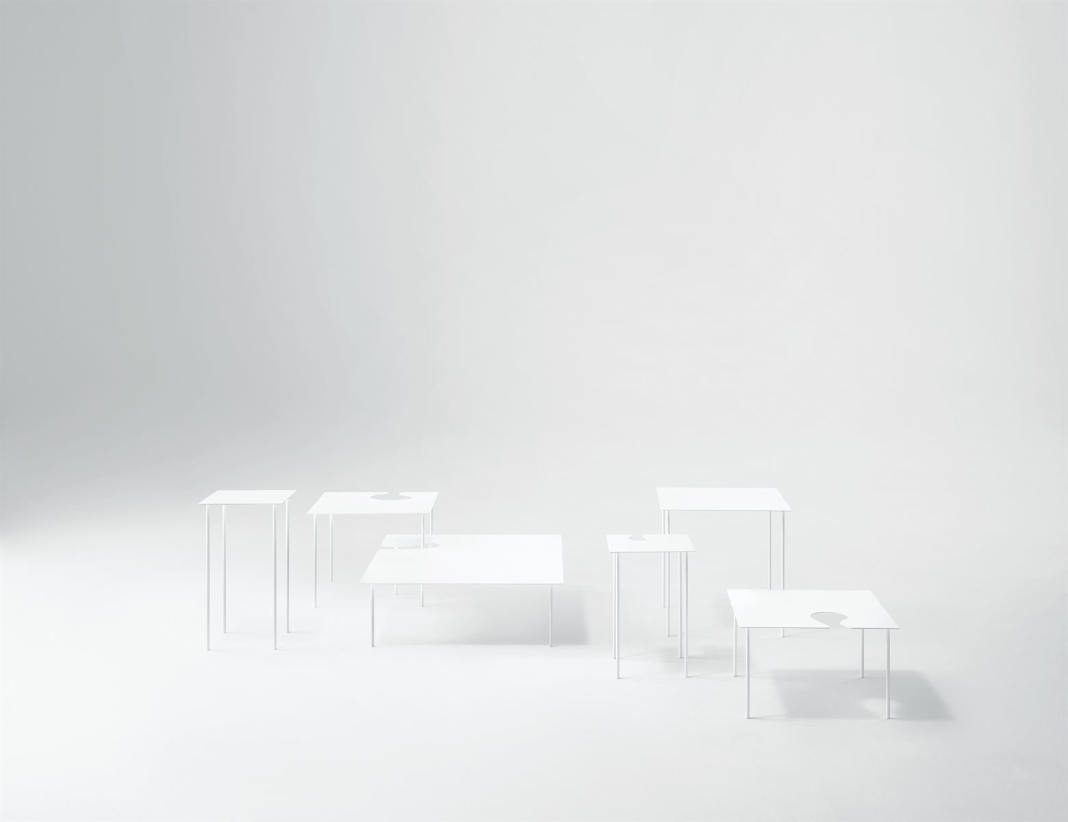 Des tables légères sculptées dans différentes formes et hauteurs complémentaires caractérisent la gamme Softer than Steel.