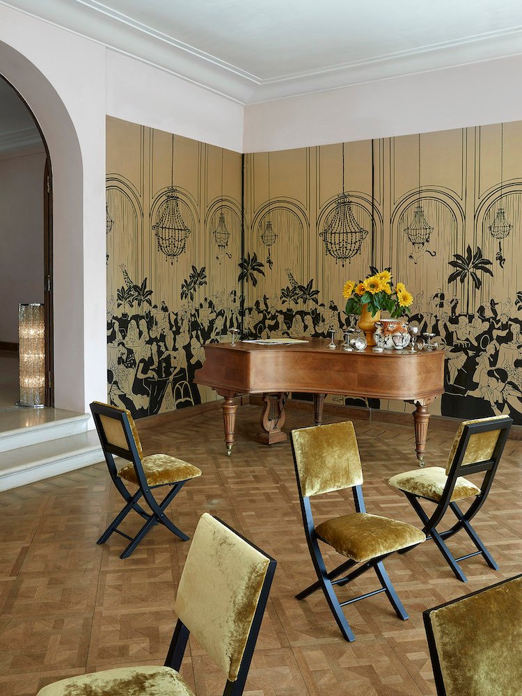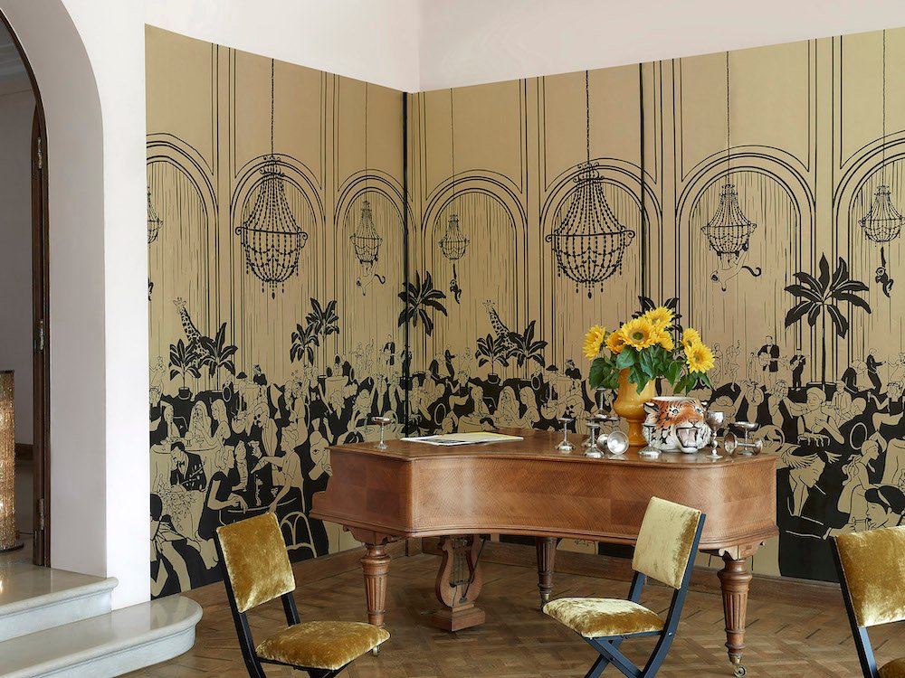 Si les images du bal surréaliste donné par les Rothschild en 1972 sont devenues iconiques, ce dessin panoramique nous rappelle que la première soirée du genre fut initiée par Salvador Dali en 1941, au sein du prestigieux Hôtel Del Monte en Californie, afin de récolter des fonds pour les artistes européens fuyant le régime nazi. Comme une invitation à plonger dans ce décor incroyable, ce papier peint panoramique est raccordable à souhait.