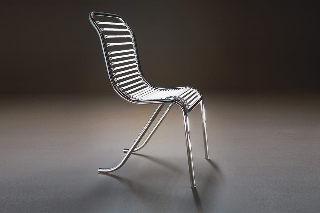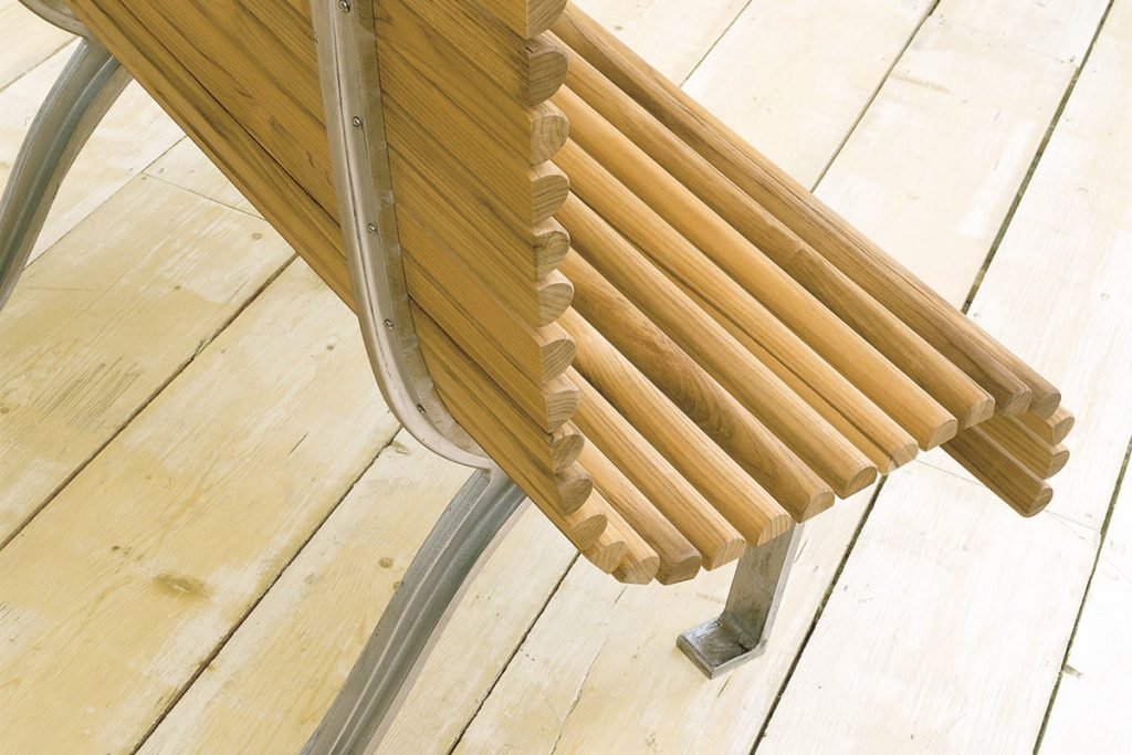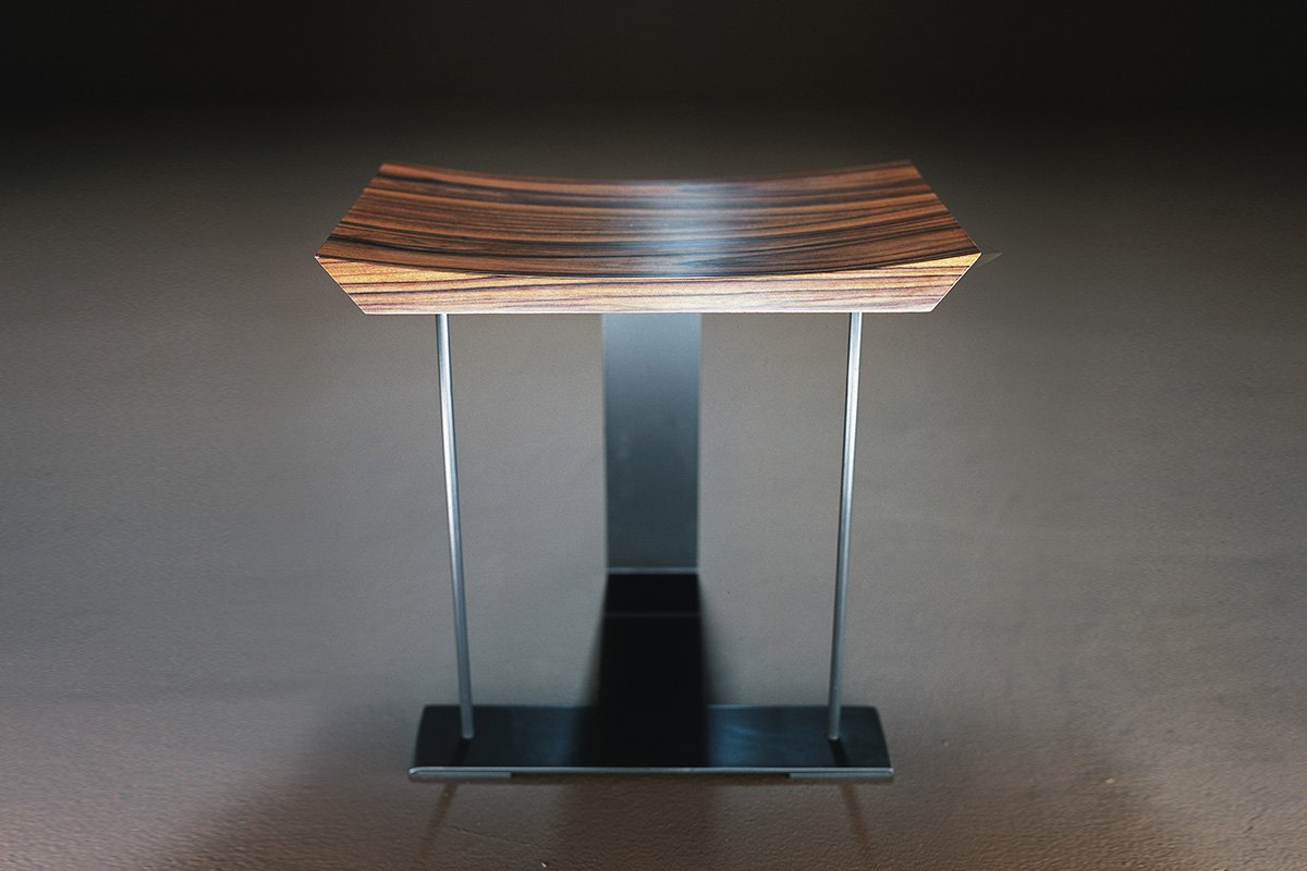 Piétement en plat d’acier laqué anthracite, assise incurvée en chêne. Teintes : naturel, marron, wengé ou noir. Egalement disponible en palissandre.