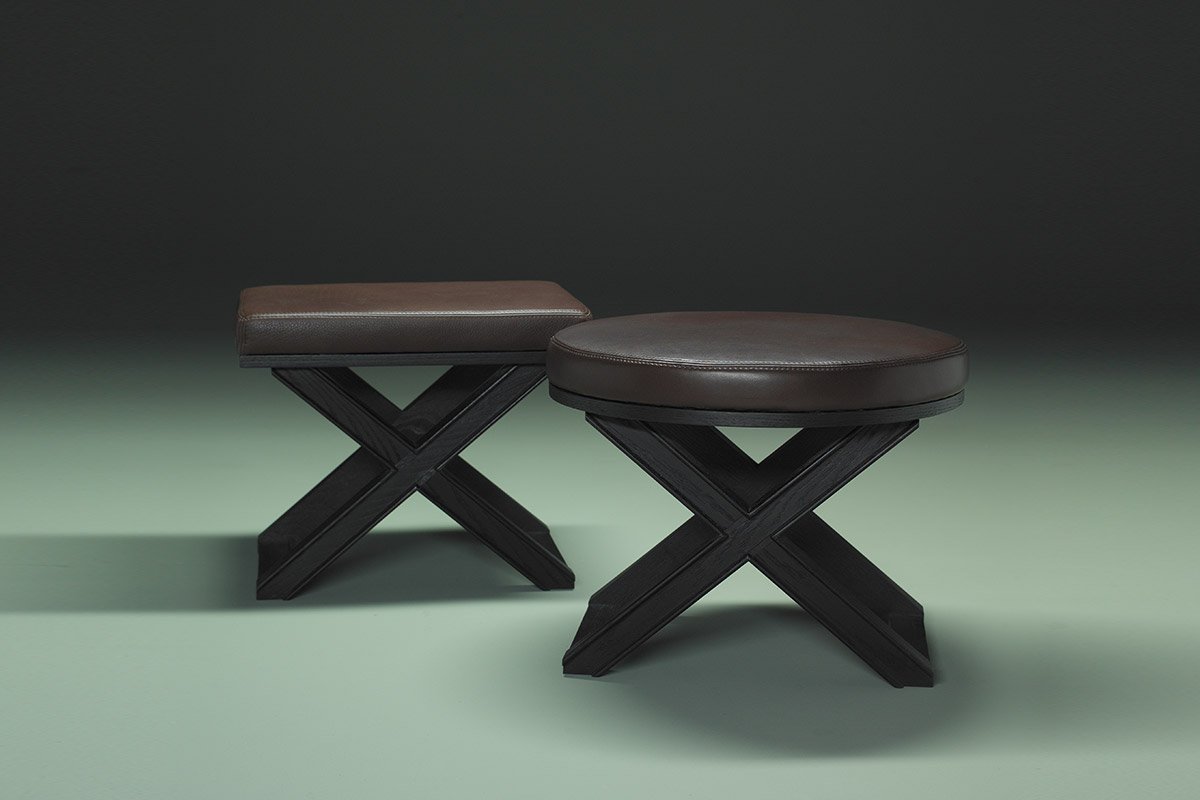 Structure en chêne massif sablé ou non. Teintes disponibles : naturel, marron, wengé, noir, gris et chêne des marais. Assise tapissée en tissu ou cuir. Existe aussi avec une assise ronde diam: 55 cm.