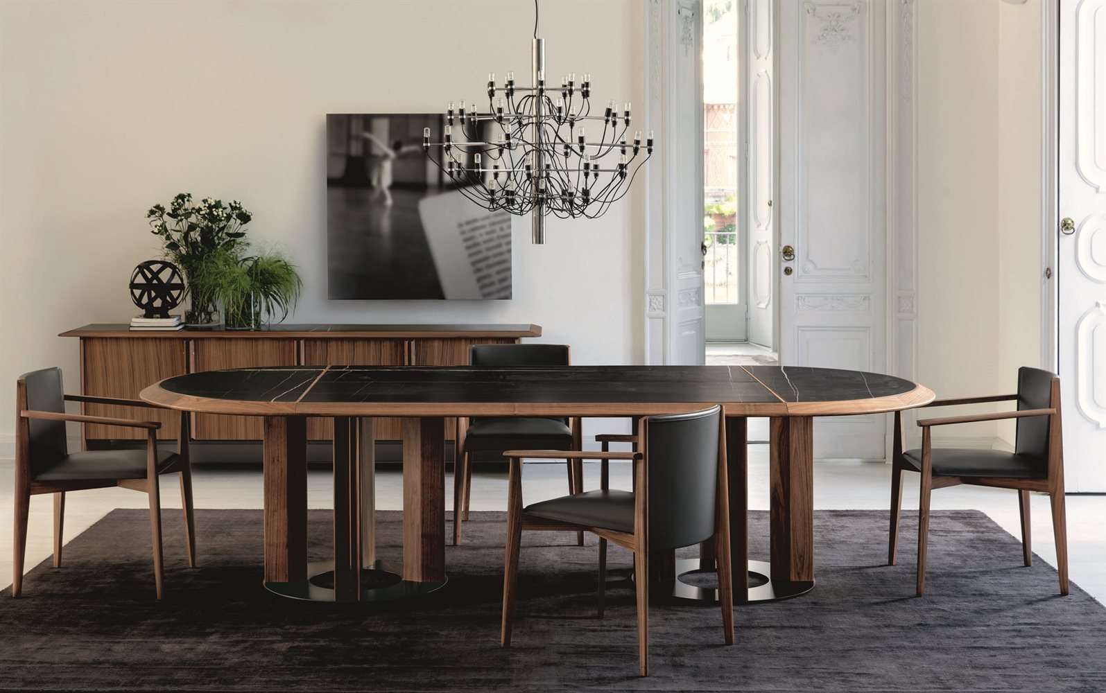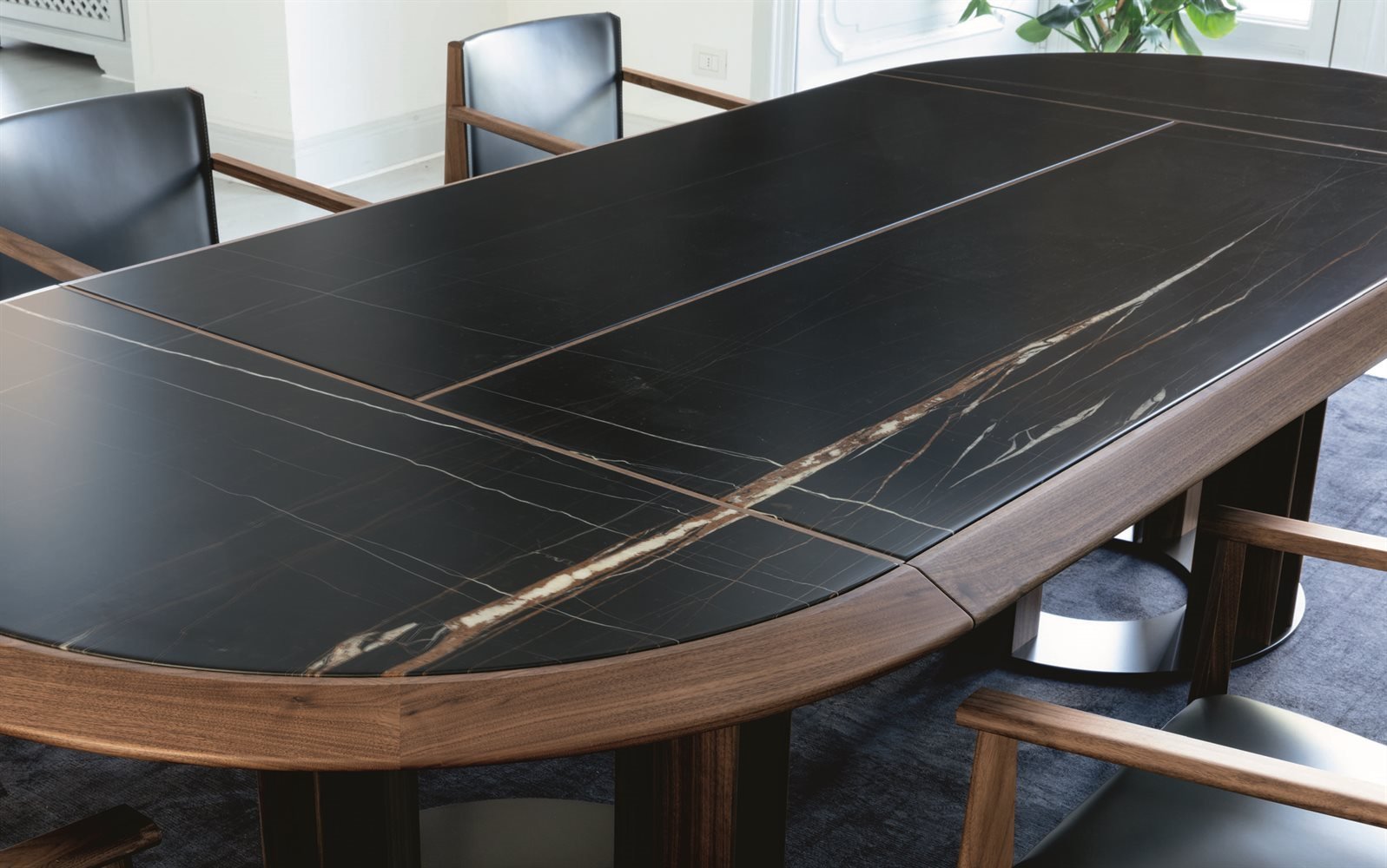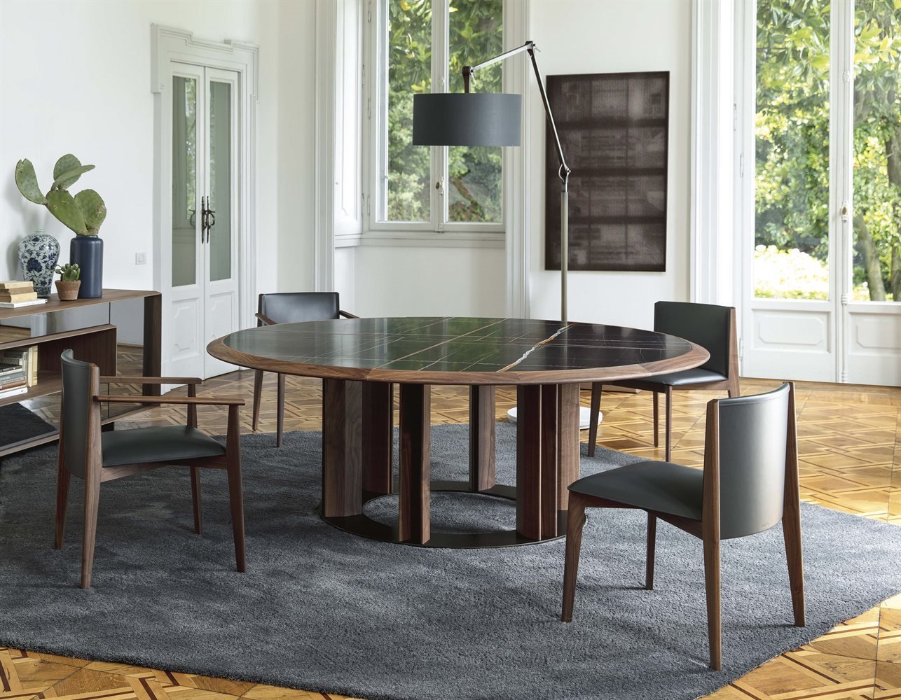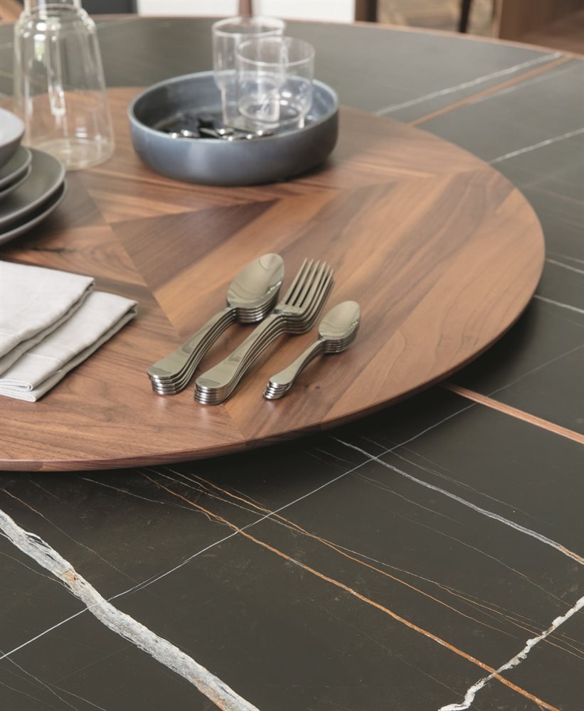 Table à manger ronde en noyer canaletta massif et plateau en marbre ou en bois divisé en quatre sections. Base en métal/bronze.