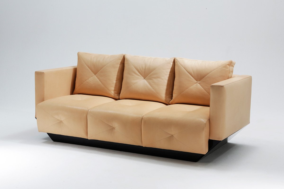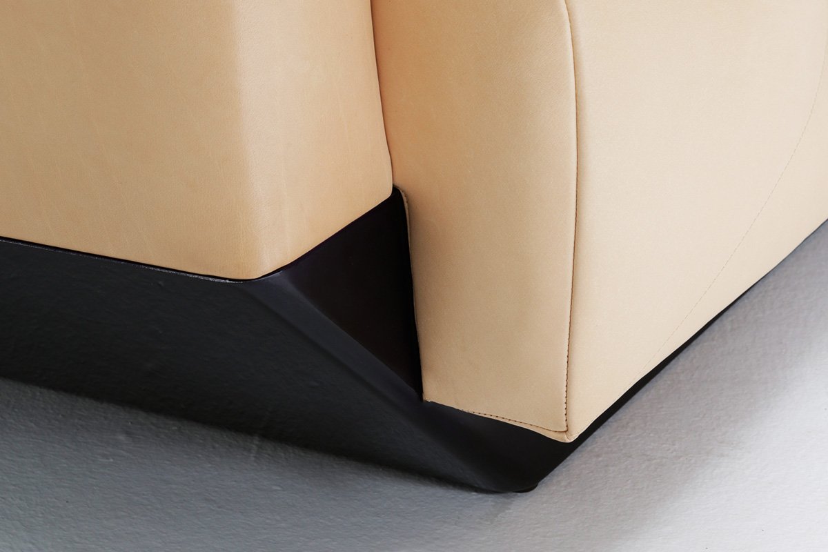 Siège matelassé en croix, socle en laqué brillant à assortir suivant le choix du revêtement.